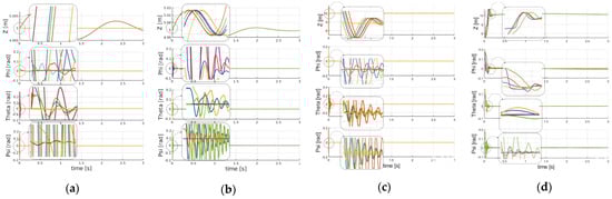Comparing (a) optimized and (b) non-optimized PMSM-Quadrotor UAV system’s performances for a hovering stabilization task. Comparing (c) optimized and (d) non-optimized PMSM-Quadrotor UAV system’s performances for a maneuvering stabilization task. Simulations performed with a set of random initial conditions.