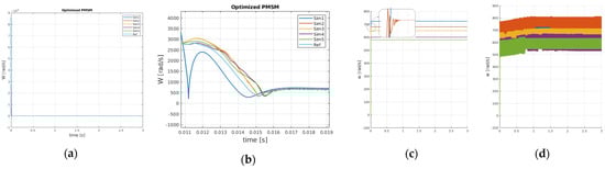 Figure 4a,b show the optimized dynamics of one motor during one of the maneuvering stabilization tasks of Figure 3. Figure 4c,d show the comparison of the performance of one motor for different reference velocity signals in case of optimized and non-optimized controller. Again, faster dynamics and oscillations reduction are observed due to the PSO optimization of the speed controllers.