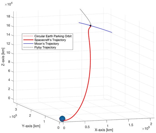 The designed trajectory of the spacecraft from a circular Earth orbit of an altitude of 400 km to be inserted into a circular Moon orbit of an altitude of 100 km is shown in a Geocentric Celestial Reference Frame (GCRF).