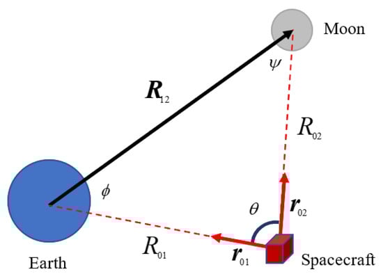 The triangulation technique was investigated to estimate the spacecraft position throughout the translunar trajectory. The fundamental principle relied on the geometric relationship formed between three bodies, the spacecraft, Earth, and Moon, as shown in Figure 2. This configuration naturally created a triangle where two vertices represented the known positions of the celestial bodies, which were obtained through ephemeris data, while the third vertex represented the spacecraft’s unknown position. With the spacecraft’s known attitude, it was assumed that the unit LoS vector measurements and to the Earth and Moon were extracted from camera images taken in the Geocentric Celestial Reference Frame (GCRF). This approach is suitable for cislunar navigation, where both celestial bodies remain consistently visible and their positions are well-defined through ephemeris data.