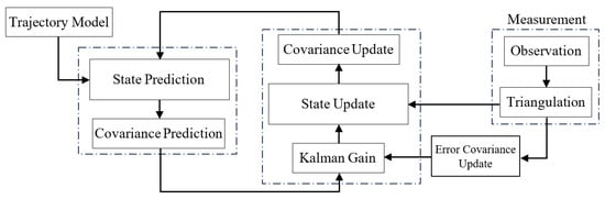 To analyze the performance of the proposed vision-based navigation system, an Extended Kalman Filter (EKF) was implemented using the sequential position measurements based on triangulation with noisy LoS vectors and the mathematical trajectory model of the spacecraft based on the previously mentioned three-body approach. The EKF, which extends the traditional Kalman Filter to handle nonlinearities in onboard real-time systems, is suitable for this application as it can effectively manage the nonlinear nature of spacecraft orbital dynamics []. Through the EKF’s recursive prediction and update steps, the navigation solution continuously refines its position estimates using the triangulation-based measurements from the observed celestial bodies. The initial conditions for the position estimates are derived from the triangulation measurements. Similarly, the initial velocity estimates were taken as the orbital velocity of the spacecraft in its circular orbit prior to the TLI maneuver. These initial conditions provide a reasonable starting point for the EKF to iteratively refine both position and velocity estimates throughout the trajectory. The flow diagram of the sequential EKF with corresponding model and measurement updates are shown in Figure 3. At each step of the filter, the measurement error covariance matrix is dynamically updated based on the characteristics of the incoming measurements to account for variations in measurement noise.