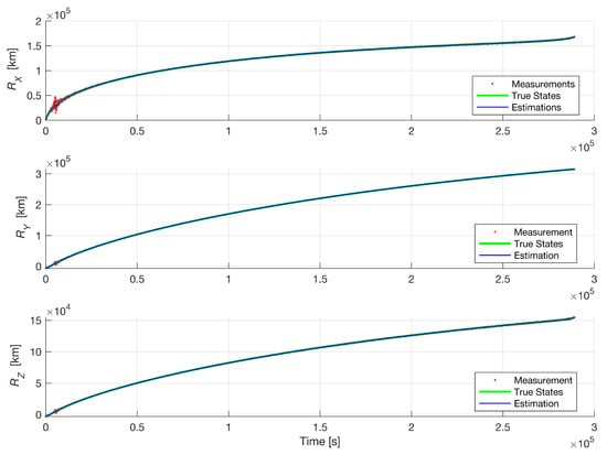 Position estimation results obtained by the EKF are presented in Figure 4. It may be observed from the given figure that the calculated position measurements from the triangulation between approximately t = 3000 and t = 10,000 seconds exhibited increased error variance. This phenomenon occurred because the angle between the LoS vectors to the Earth and Moon approached in this time interval. When this occurred, the sine function in the denominator approached zero, leading to numerical instability in the triangulation calculations. This observation suggests that for more accurate results, the LOS vectors should not be aligned as parallel or anti-parallel. Despite the increased error variance in triangulation measurements, the EKF managed to provide more consistent position estimations.