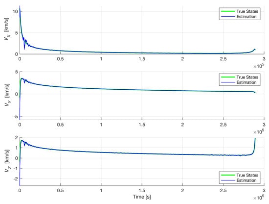 The velocity estimation results obtained by the EKF are presented in Figure 5. The estimated velocity aligns well with the true velocity states over the trajectory. This indicates that the EKF effectively utilized the measurements and the trajectory model to produce consistent velocity estimations. However, in the interval with the increased measurement error variance due to approaching an anti-parallel alignment in the LoS vectors, the velocity estimations exhibited fluctuations from the true values.