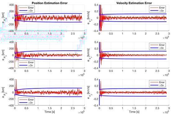 The EKF showed comparable performance in state estimation, with the estimations converging and remaining within the confidence intervals. The position and velocity estimation errors relative to the true states exhibited reasonable values throughout the trajectory. The position and velocity errors with their respective error covariances are presented in Figure 6, showing that the estimation errors remained bounded within the confidence bounds except in the region of increased measurement error variance.