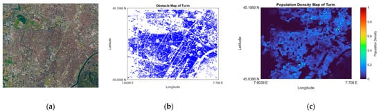 The geographical location of the area of study (Turin, Italy): (a) satellite image of the study area; (b) obstacle map of the study area; (c) population density map of the study area.