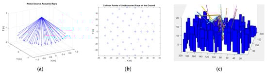 The noise source: (a) the acoustic rays emitted from the source at an altitude of 40 m; (b) collision points of the unobstructed rays on the ground. (c) Synthetic representation of the scenario with buildings and the consequent reflection of acoustic rays.