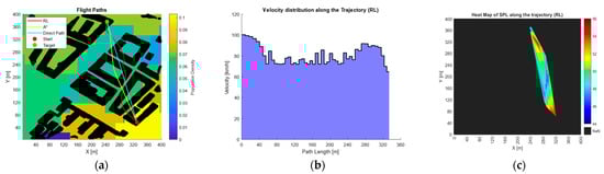 (a) Flight paths for the RL, A* and direct paths. (b)Velocity distribution along the RL flight path. (c) Heat Map of the SPL distribution along the RL path.