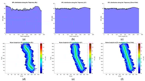 (a) SPL distribution along the RL path; (b) SPL distribution along the A* path; (c) SPL distribution along the direct path; (d) Top view of noise impact in the environment for RL path; (e) Top view of noise impact in the environment for A* path; (f) Top view of noise impact in the environment for direct path.