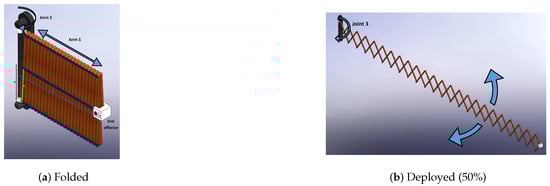 The proposed EHS is based on a scissor boom structure with different DoF according to the mission requirements and CubeSat structures. Figure 2 shows an initial design of the proposed system. It has been chosen due to its mechanical simplicity and capacity to be extended a greater distance than other structures, such as simple manipulators. However, analysis of the lateral stability is pending according to the materials used and the particular application. The proposed system is initially provided with three joints (3DoF): The first joint allows the system to extend and retract the end effector, actuating on the bar that holds the scissor structure. The second joint allows the main scissor structure to be re-oriented. Finally, the whole EHS can be rotated by the third joint. These three DoF allow one to place the end effector at any position within the EHS workspace.