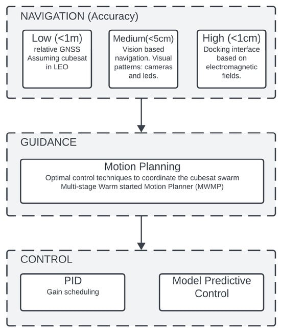 However, the use of the EHS in combination with the CubeSat actuators requires an advanced GNC. This paper proposed a three-level navigation component by combining GNSS, vision-based navigation, and electromagnets for the docking stage. In the case of guidance, it requires complex motion planning methods to coordinate the CubeSat swarm. Finally, control requires classical PIDs in combination with other advanced techniques, such as gain scheduling and MPC due to the non-linearities in the EHS.