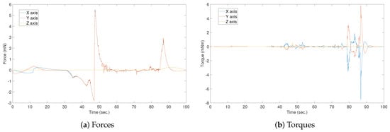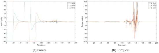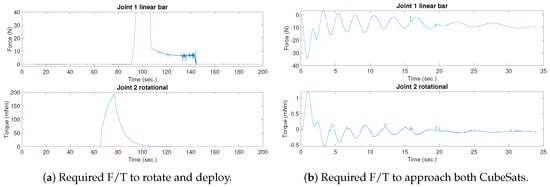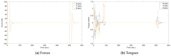Figure 8 shows the required forces and torques to move the CubeSat and deploy the EHS. On the other hand, Figure 9a shows the required forces and torque from the EHS to be deployed and extended.