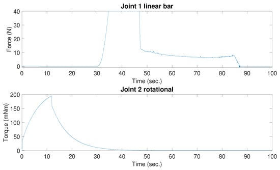 To demonstrate the required forces to move the EHS, the CubeSat was controlled to keep the initial pose, while the EHS was rotated 135º and deployed 4.5 m. Figure 6 shows the resulting force and torque to keep the CubeSat in a fixed pose. As can be seen, the maximum required forces were 5.527 mN for the X and Y axes and 2.942 mN for the Z axis. The system required a total energy of mNs, mNs, mNs) for the X, Y, and Z axes, respectively. The maximum required torque was mNm, mNm, mNm) for the X, Y, and Z axes. On the other hand, the actuator of joint 1 from the EHS was limited to 40 N, and joint 2 required a maximum torque of 194.1 mNm, as shown in Figure 7.