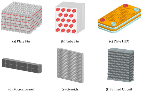 In electric aviation, selecting the appropriate HEX types based on thermal requirements is critical, particularly for fuel cell system applications. This study investigates both conventional and advanced HEX designs, evaluating their suitability for these demanding environments. Established designs like plate and extended surface HEXs are widely used for their proven effectiveness and manufacturability. Extended surface HEXs, including plate-fin and tube-fin configurations, are widely used for their versatility. Plate-fin HEXs are preferred for their compactness, while tube-fin designs excel in high-pressure applications. Microchannel heat exchangers (MCHEs), characterized by various channel geometries (e.g., square, rectangular, circular, hexagonal, and trapezoidal), offer exceptionally high surface area-to-volume ratios, thereby enhancing heat-transfer efficiency. Triply Periodic Minimal Surface (TPMS) designs, with intricate structures like diamond, gyroid, and primitive configurations, show improvement in heat transfer via complex internal fluid pathways. Similarly, printed circuit heat exchangers (PCHEs), fabricated through chemical etching processes, feature zigzag and aerofoil-shaped channels, offering high thermal performance and compactness. The various HEX types discussed are illustrated in Figure 1. Their operational principles are well-documented in the literature [7,8,9].