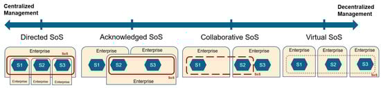 In today’s interconnected world, engineered systems have become highly interconnected with other systems operating in the same environment. These systems can be increasingly recognized as part of a system of systems. The term system of systems refers to systems operating collaboratively while producing behavior that the individual systems cannot produce on their own. The systems composing a system of systems are referred to as constituent systems []. The passenger transport network is an example of a system of systems, where many different transport modes enable a passenger to undertake intra- or intercontinental journeys. In this context, aircraft are constituent systems that allow transport through the air, while buses and trains are constituent systems that enable transport on the ground. The characteristics of a system of systems are geographical distribution, emergent behavior, evolutionary development, operational independence, and managerial independence. The last two characteristics are recognized as the taxonomic classifiers distinguishing systems of systems from conventional large-scale systems []. Systems of systems can be further classified by their level of centralized management and authority. This level expresses that the coordination and decision-making can be distributed across the constituent systems. It indicates whether there is a central entity, such as an enterprise or a business unit, that has control over the entire system of systems or if the power of decision-making is more decentralized. Maier identifies three types of system of systems based on the level of centralized management and authority []: directed, collaborative, and virtual systems of systems. Additionally, Dahmann [] recognizes the need for a fourth type of system of systems: the acknowledged system of systems. The four types of system of systems are depicted in Figure 1, ranging from highly central management to more distributed responsibilities and decision-making, characterized by the ownership of systems by enterprises.