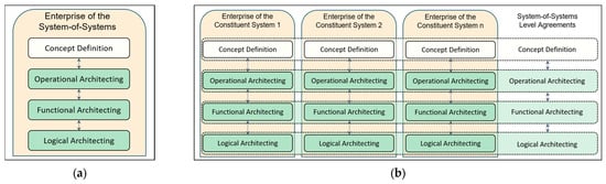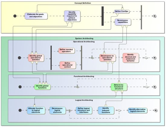 The methodology proposed in this section shows how to derive the architecture of a system of systems during the concept and development stages of its lifecycle. It builds on the initial phase of problem definition, which clearly describes the problem that the solution aims to address, and the system specification, which translates the problem into requirements that define the solution. These processes are not covered in this paper. The system of interest to be developed depends on the type of system of systems and the perspective taken, and may refer to either a constituent system or the entire system of systems. The resulting architecture includes both the composition and the conceptualized operations, with operations represented through their respective functions. The methodology consists of a process, a method, and a tool, whereas the last two aspects comprise the implementation of the process. The process consists of a sequence of tasks that are intended to serve as a guideline for the engineer to architect the system of interest (adapted from []). The process is further divided into four main segments, three of which refine the architecting process. The fourth segment is supplementary, aimed at defining the abstract concept regarding the system of interest. In this segment, the enterprise’s strategic orientation plays a significant role independent of the technical problem that needs to be solved. The architecture of the system of interest is developed iteratively, beginning with operational architecting. The operational architecture describes the interactions among the constituent systems within the operational environment, as well as the operations of each individual constituent system. Subsequently, the functional architecture derives functions that outline what needs to be done. With the help of these functions, the logical architecture identifies elements capable of fulfilling the functions and, together, composing the system of systems.