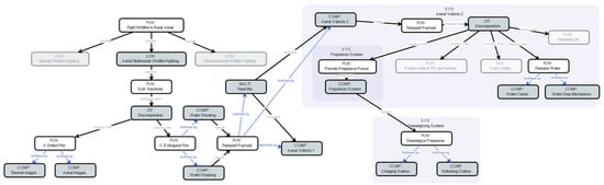 The analysis begins with the strategic orientation of the enterprise in the concept definition. The wildfire fighting force does not have profit as its primary goal. Its identified objective is to extinguish wildfires with the aim of minimizing environmental impact at the lowest deployment cost. The high-level capability, shown at the top of the graph in Figure 4, is to fight wildfires in rural areas. Various ConOps are identified, each representing a different strategy for combating the fire. The wildfire fighting force can operate solely on the ground, without any tools, or using a combination of ground and aerial modes. The latter option is chosen and further analyzed. The global operations required to fight the fire are divided into several main tasks, such as detecting and extinguishing the fire. Using the function–component approach, these tasks are also represented as functions. For simplicity, the operators and operational context are not further examined here. Instead, the operational tasks are connected to different operational methods, which represent the lower-level activities that fulfill the decomposed capabilities. To detect the fire, there is a choice between the use of conventional aerial images or thermal images. To extinguish the fire, different methods can be considered, such as shooting pressurized water or releasing water incrementally by gravity. These alternative ways of performing the operations depict choices from among which the engineers can choose. Afterward, functions are identified to describe the elements which can conduct these operations. The main function, which is induced by the different ways to extinguish a fire, is to transport a payload. The following procedure combines functional architecting with logical architecting by leveraging the natural flow between functions and the elements that fulfill them. The choices that fulfill the main function of transporting a payload include different types of aerial vehicles or a combination of multiple vehicles. Each vehicle has its own set of functions to be fulfilled. In the case of aerial vehicle 2, two functions are further analyzed. Depending on the choices for extinguishing the fire, different architectural elements are required, such as a water drop mechanism or a water cannon. To provide propulsive power, a propulsion subsystem is necessary. These subsystems, in turn, induce the need for another system outside the aerial vehicle’s boundaries: a reenergizing subsystem for the propulsion system. Depending on the propulsion, specific reenergizing stations are required.