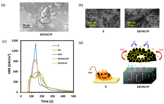 (a) FESEM captures of the cross-section of ESiTAC1P, (b) FESEM images of the residual char obtained after UL-94 test of E and ESiTAC1P, (c) heat release rate curves, and (d) flame-retardant mechanism of epoxy nanocomposites containing coffee biochar (reprinted with permission from [16]). Copyright (2024) Elsevier B.V.
