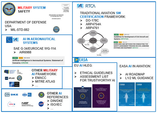 The military aviation system is conceptualized as a network of systems [10], where Artificial Intelligence is anticipated to play a crucial role in highly automated and safety-critical components [11]. This system is subject to both civilian and military aviation regulations and certification processes [12]. Consequently, the following areas of regulation and standardization are deemed highly pertinent in establishing the standardization framework for the development, validation, and certification of AI-based safety-critical components. This information is also crucial for comprehending and distinguishing the current requirements in constructing such a framework.