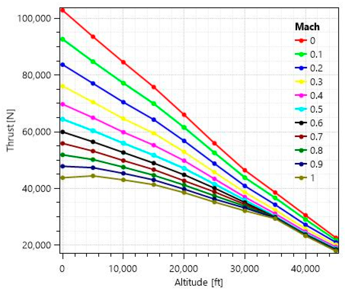 As mentioned in the previous section, the two tools employed for sizing airframe and engine cycle analysis are SUAVE and TURBOMATCH, respectively. The first step in the aircraft engine sizing loop is to define the basic aircraft and mission in SUAVE. Initially, the aircraft uses a low-fidelity engine performance model. This low-fidelity turbofan model calculates thrust and fuel consumption based on atmospheric conditions, throttle settings, and Mach number using simplified empirical relationships. It outputs thrust as a 3D vector and fuel flow rate, integrating these into the aircraft’s performance framework. The model assumes ISA atmospheric conditions, a modern turbofan throttle ratio, and a constant specific heat ratio for quick, conceptual-level analyses. As part of the post-processing for the converged aircraft, a number of thrust requirements are calculated. The same is presented in