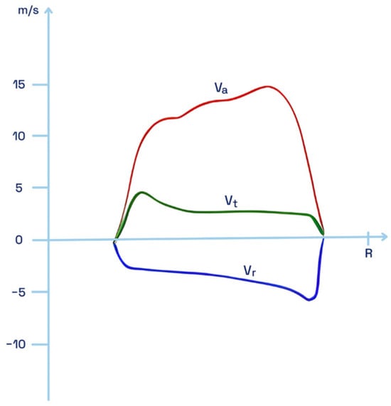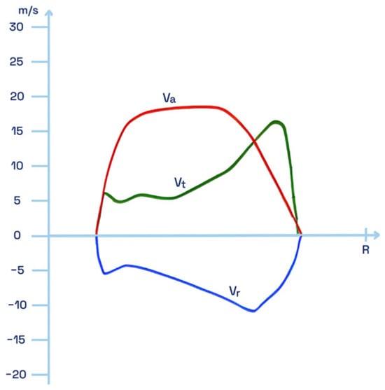 The three components of a propeller slipstream: —axial velocity, —tangential velocity, —radial velocity.