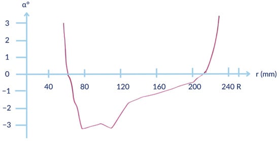 The radial distribution of the angle of attack for the fine-pitch configuration (geometric pitch equal to 1/3 of the propeller diameter), which corresponds to the highest efficiency of 83%, is presented in Figure 4.
