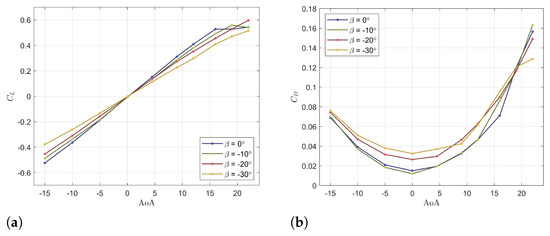 Closed − wing lift–drag curve: (a) lift coefficient vs. angle of attack for different slide angles and ; (b) drag coefficient vs. angle of attack for different slide angles and .