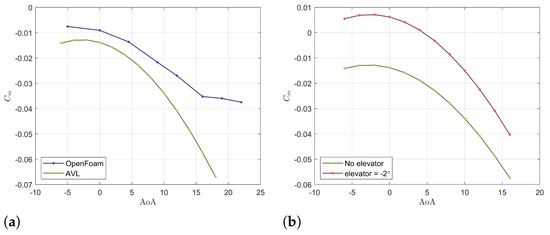 (a) Comparison of pitching moment curves obtained using OpenFoam and AVL software; (b) comparison of pitching moment curves with different elevator deflections using AVL.