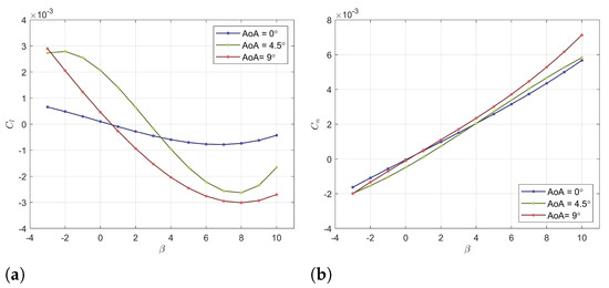 Lateral− directional stability curves produced in OpenFoam: (a) roll moment coefficient with respect to for three different AoAs; (b) yaw moment coefficient with respect to for three different AoAs.