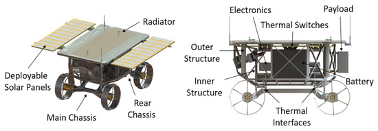 In recent years, both national space agencies and private ventures have intensified their efforts to advance lunar accessibility, exploration, and resource utilization [1]. The use of unmanned robotic rover systems is becoming vital in exploring the moon’s challenging terrain. While the lunar rovers of recent decades have typically been large, complex, and heavy, research is increasingly shifting towards smaller, lightweight micro rovers [2]. Even though compact designs promise comparably low launch costs and the opportunity for swarm exploration, unique challenges are imposed by the harsh lunar thermal environment. As a consequence, the majority of state-of-the-art micro rover developments are designed for a mission lifetime of the lunar day exclusively [3]. The SAMLER-KI project seeks to unlock new opportunities for rover missions by advancing designs with the capability to survive the lunar night within the micro rover class. Autonomous exploration tasks should be executable in a mission, with a total mission lifetime of at least 1.5 lunar cycles. This endeavor is further intensified by the planned landing site near the lunar equator at the Reiner Gamma swirls https://science.nasa.gov/resource/lunar-swirl-reiner-gamma/ (accessed on 25 November 2024) in the Oceanus Procellarum, where immense discrepancies in the environmental conditions between the lunar day and night are present. During the mission, a trajectory of around 900 m is planned to be traversed [4].