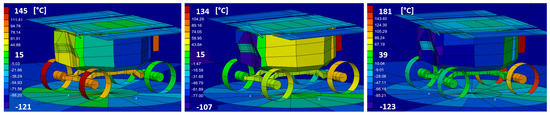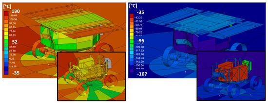A finite difference model was derived following the thermal concept and the system design. The analyses were based on multiple different steady-state load cases. These replicated the possible rover–Sun orientations during the entire mission considered to be most severe. For this article, we focused on five cases with extreme inclination values.