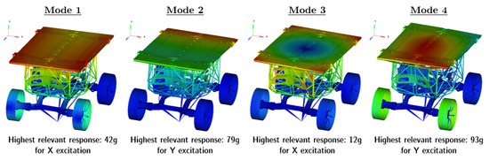 A precise representation of the rover’s geometry was also achieved using the finite element model derived from the system design, which represented the CAD model’s mass within a precision of 1%. Dedicated components are considered as mass points or as non-structural masses and are thus not geometrically visible in the results. As a simplification, at this early design iteration stage, the GFRP structures were considered to be isotropic. Distinct element quality and model checks in compliance with the European Cooperation for Space Standardization (ECSS) [9] were performed to guarantee a correct starting point for the analysis. Significant global eigenmodes of the rover system were calculated and are depicted in Table 4. These are defined as modes that excite more than 5% of the overall system mass. The current system design shows multiple global modes within the sine-equivalent region up to 100 Hz that have the potential to be excited during launch.