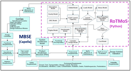 For this purpose, a Space Launcher preliminary design simulator tool (RoTMoS—Rocket and Trajectory Modular Simulator) is being developed, covering the main disciplines involved in the preliminary design of space launchers. This will enable an experimental design to analyze the parameters’ sensitivity levels to weight and cost results. The simulator modules will be integrated into the MBSE tool (Eclipse CapellaTM) by means of a mission use case (UPM-Sat Program) for the construction of the optimized space launcher system architecture and functionalities. The overall framework of MBSE&S and RoTMoS is described in Figure 1.