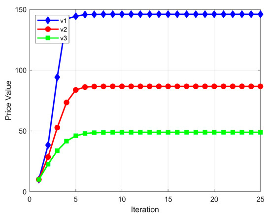 Initially, the relays sell power at cost prices. At this stage, the transmitting node purchases more power to meet the communication rate requirements of the cooperative communication system. However, the relay nodes, being selfish and rational, continuously increase their power prices to maximize their revenue. These actions lead to higher costs for the transmitting node in order to minimize its expenses while still meeting the system’s communication rate requirements. Consequently, the transmitting node reduces the amount of power purchased. After a period of bargaining and negotiation, both parties reach a game equilibrium: as the relay power price increases, the amount of power purchased by the transmitting node decreases. These findings validate the relationship between price and power in the game. Based on these results, the proposed Stackelberg-distributed iterative power control algorithm based on a non-uniform pricing mechanism is effective and demonstrates fast convergence.