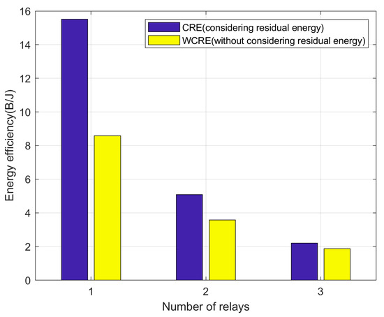 In the subsequent analysis, we used node survival time and energy efficiency to validate the effectiveness of the proposed algorithm. Figure 3 illustrates the remaining energy variation of the relay nodes over their lifetime for algorithms without considering remaining energy (WCRE) and for those that do consider this factor (CRE). Figure 4 illustrates a comparison of the energy efficiency of nodes between the two algorithms. The energy efficiency of a node is calculated using the formula , where is the total transmission rate of all relay nodes over their lifecycle, is the total energy of the node, and is the number of relay nodes involved in cooperative communication.
