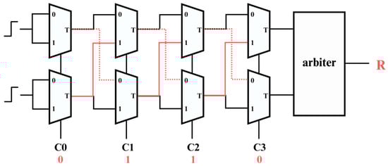 8]. Each multiplexer group is responsible for routing the input signals based on a specific challenge. A challenge is a binary sequence that determines the path taken by the signals through the multiplexers. For instance, in the first group of multiplexers that share the same signal, the challenge bit decides whether the signal takes a straight path (denoted by 1) or a cross path (denoted by 0). When there are