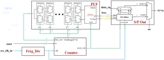 Data_out is used as the input of PUF and the challenge generated by Counter is used as the selection line. reset_out inputs the reset signal to D-Latch to clear the register data. As shown in the PUF timing diagram in