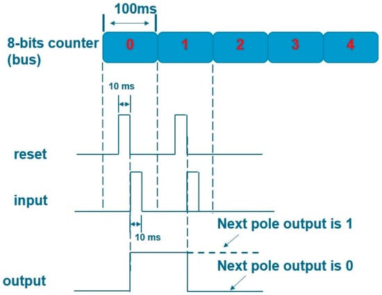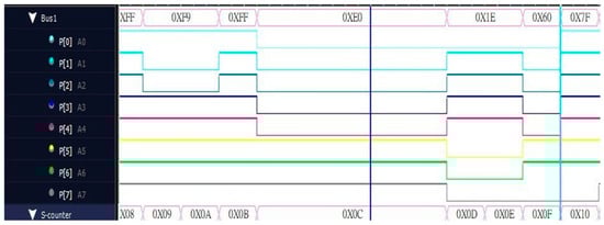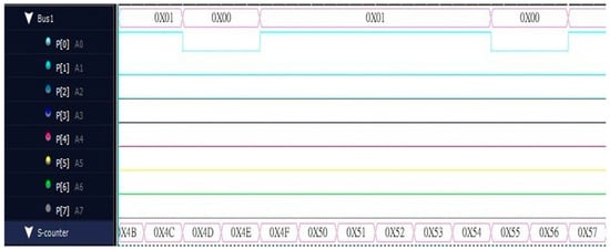 Figure 7 shows the parallel output waveform captured by the logic analyzer. The upper half synthesizes the output 8-bit value into the bus, which is more convenient when compared with the serial output, while the lower half is the counter calculation. The purpose of the numerical value is to know what the output value is at which point in time.