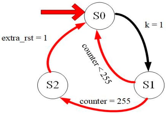 Figure 4, a state machine can be used to control the executed program. It initially enters S0. Every time a piece of data is received, the counter increases by 1 and sends a k = 1 signal. S1 sends reset and input signals and determines whether the counter value is equal to 255. If not, the value becomes S0, and counting continues. If yes, S2 is input, data transmission completes, and counting stops. The value returns to S0 and the next take starts.