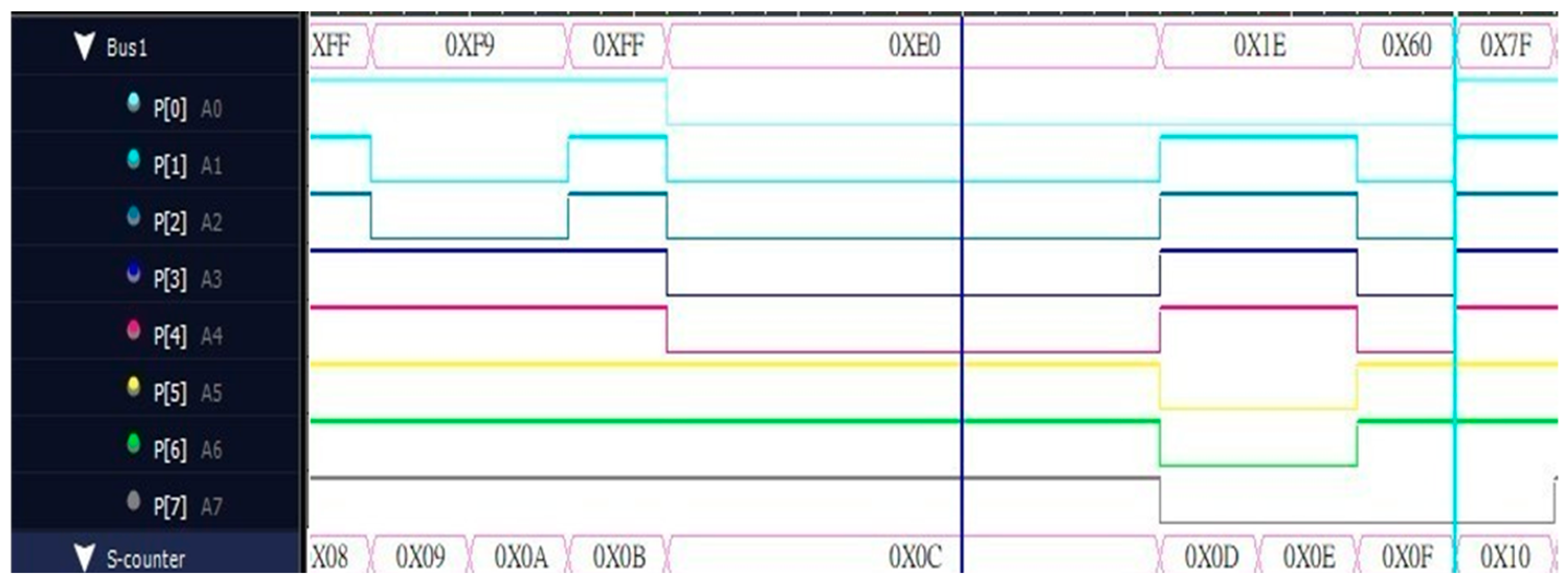 Figure 6, it is the serial output waveform captured by the logic analyzer. The developed serial output is P[0] in the output pin P[7:0] for output, and the lower half is the counter value. Therefore, the output value is regarded as a point in time.