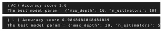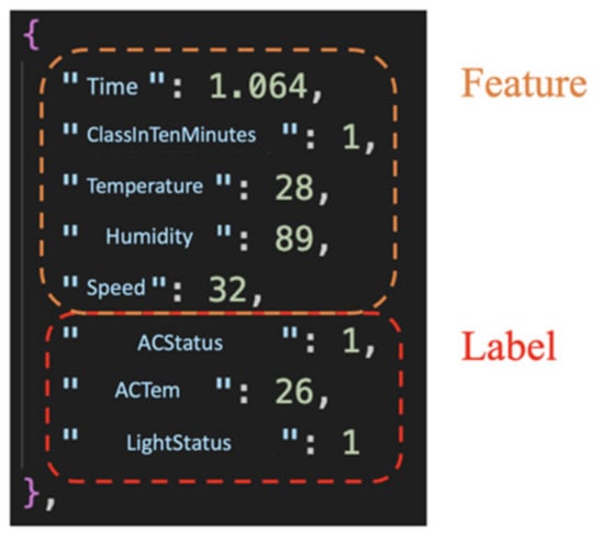 Environmental data were collected every 10 min from temperature, humidity, and wind speed sensors. These data were imported into the system according to the curricular schedule as “features” and used to control the current air conditioner status (on/off), temperature setting, and light status as “labels”. The collected data for one week were included in a dataset for the RF model after being preprocessed. Since the collected time format included the date and time, they were converted to a week format to assess how the day of the week affected behaviors during the learning process of the RF model. Using Python’s ML library and scikit-learn, which require the feature values in the dataset to be floats or integers, we converted the time into minutes, divided it by 10,000, and then added the integer representation of the day of the week to it. This completed the time “encoding” process, as illustrated in
