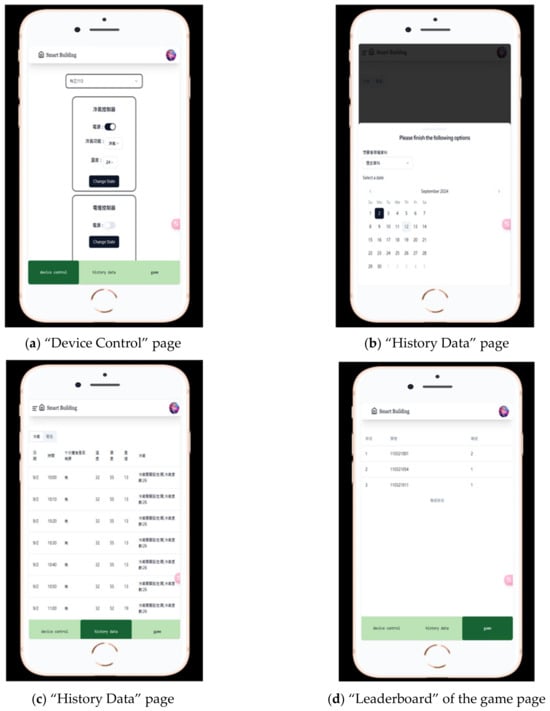 Figure 8b,c), which offered two types of information: historical data and electricity consumption statistics. Users selected the desired date and retrieved the data results. The game page (
