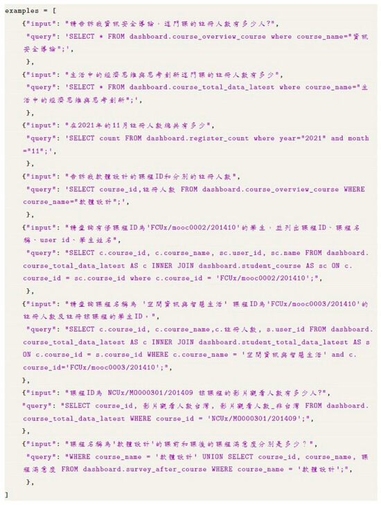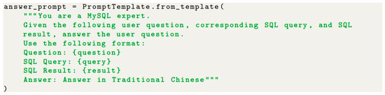 The prompts in this study were divided into three categories: information on database tables, natural language descriptions of tables and columns, and SQL query examples. In LangChain, the SQL database class was constructed using table information prompts and the create table command. The first three rows of data from the table were used in the database. To enhance the LLM’s recognition and understanding of tables and columns, we created a document containing descriptions of the database tables and their columns and added it as a prompt. To increase the accuracy of SQL queries, we used the few-shot prompting method to add prompts. A few-shot prompt is a small set of input=output examples that enables the model to learn. We created an example set, where each example included a user’s input question and the corresponding SQL syntax as shown in Figure 2. By providing these examples, the LLM’s accuracy in generating SQL syntax was improved.