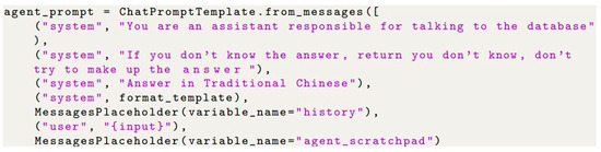 In the agent setup, we configured a prompt named agent prompt using the chat prompt template. This chat prompt model included three role parameters: system, human, and AI. In the system, we added role settings that first instruct the system that it is an assistant responsible for conversing with the database. Additionally, when the system did not know the answer, the “I don’t know” prompt appeared instead of fabricating an answer. This method reduced the occurrence of hallucinations by the LLM as shown in Figure 3.