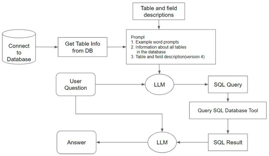 To design of sequential query, we obtained the SQL query syntax, executed the SQL query syntax, and converted the results into natural language. Based on these three steps, we named the method a sequential query. All the steps were linked into a chain to query the database using natural language. The overall process is shown in Figure 5.