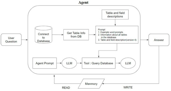 The LLM receives the user’s questions, prompts, and historical records. At this point, the agent selects the appropriate tools and executes the corresponding actions based on the user’s question. Specifically, the agent constructs a query syntax based on the semantics of the question and passes it to the LLM as a reference for tool use. After the agent arranges all the steps, the Query Database tool generates the SQL query syntax and executes the query to obtain the results. Finally, the LLM converts the query results into a natural language response and stores the question and answer in memory. In the next query, the agent refers to the previous dialogue records to respond. The operation process of the agent query is shown in Figure 6.