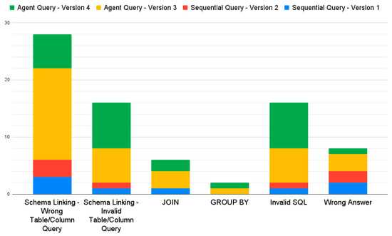 Error analysis results are shown in Figure 8. The primary error type across all four versions was schema linking. The frequency of schema linking errors was higher in the agent query versions, specifically including wrong column queries, wrong table queries, invalid column queries, and invalid table queries. In particular, Version 3 showed the highest proportion of errors related to querying incorrect tables or columns, indicating a significant disadvantage in table and column recognition. In contrast, the sequential query versions had a lower frequency of schema linking errors.