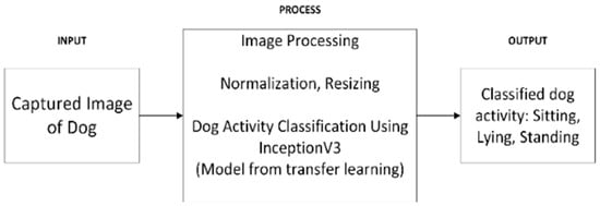Raspberry Pi 4 was used as the microcontroller for processing input images, with the Raspberry Pi Camera integrated to capture images of dog activities. Captured images were preprocessed to fit the model’s data requirements. The dog images were resized to 299 × 299 pixels. Then, the pixel values were normalized between 0 and 1 to enhance model performance, stability, and consistency for prediction. The CNN model implemented with transfer learning analyzed the input images and extracted their features for processing. Upon completion, the model output the recognized dog activity based on the features. The model ensured accurate and reliable detection of various dog activities for effective monitoring and analysis.