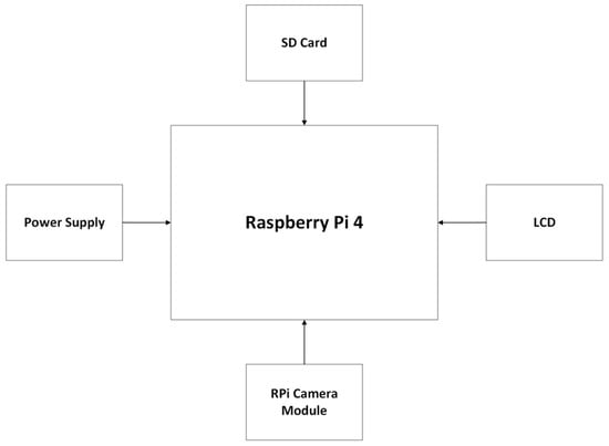 We designed the device for monitoring using Raspberry Pi parts, a power source to supply 5.1 V and 3 A, and a USB-C [13]. An SD card with a 32 GB capacity was used to run the Raspberry Pi OS and the image classification program. The CNN model trained on InceptionV3 was programmed into the Raspberry Pi for image classification and processing. The Raspberry Pi camera module was used to capture images of the dog with its 8-megapixel camera [14]. The status of the dog’s activity was displayed on the connected 3.5-inch LCD (Figure 2).
