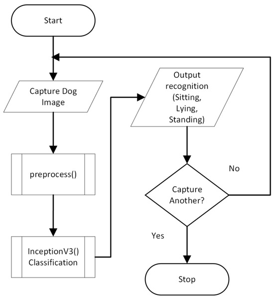 Figure 3 illustrates the system operation flowchart, beginning with image data input captured with a Raspberry Pi camera. When the system receives an image of the dog, it preprocessed the image, including resizing and normalization. Next, the image was recognized by InceptionV3, followed by classification of the dog’s activity. To implement the image classification, the OpenCV library was used. The processed output was displayed on the LCD. After displaying the classified image, another image was captured to recognize and classify images.