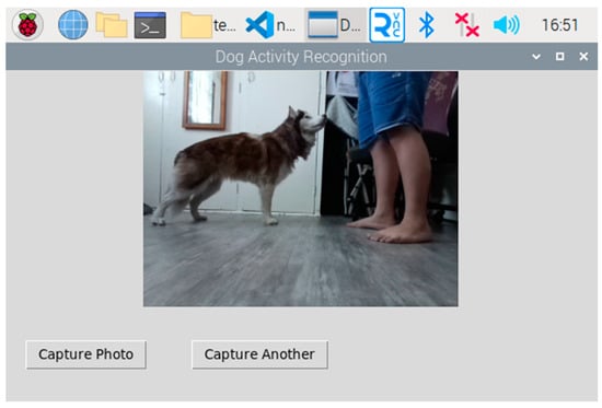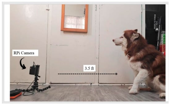 For the experiment, an LCD monitor and Raspberry Pi camera were connected to the Raspberry Pi 4. The devices were positioned facing the dog to classify its activity. The camera module was set to have a fixed-focus lens with a focal length of 6 mm and an aperture of f/2 and was positioned 3.5 feet from the dog. The recognition results were displayed on the LCD monitor. The model program in Raspberry Pi OS was stored on an SD card integrated into Raspberry Pi 4 (Figure 4).